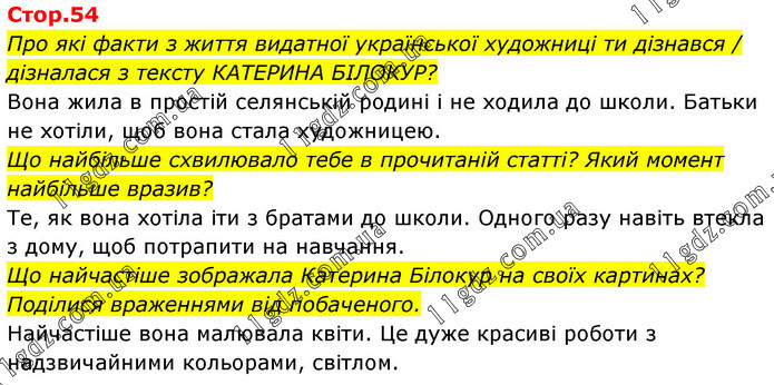 Про які факти з життя видатної української художниці ти дізнався / дізналася з тексту КАТЕРИНА БІЛОКУР? Вона жила в простій селянській родині і не ходила до школи. Батьки не хотіли, щоб вона стала художницею. Що найбільше схвилювало тебе в прочитаній статті? Який момент найбільше вразив? Те, як вона хотіла іти з братами до школи. Одного разу навіть втекла з дому, щоб потрапити на навчання. Що найчастіше зображала Катерина Білокур на своїх картинах? Поділися враженнями від побаченого. Найчастіше вона малювала квіти. Це дуже красиві роботи з надзвичайними кольорами, світлом.