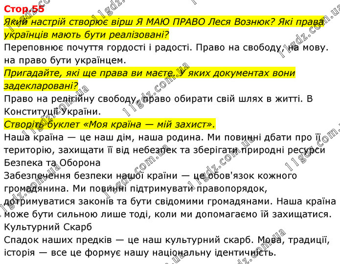 Який настрій створює вірш Я МАЮ ПРАВО Леся Вознюк? Які права українців мають бути реалізовані? Переповнює почуття гордості і радості. Право на свободу, на мову. на право бути українцем. Пригадайте, які ще права ви маєте. У яких документах вони задекларовані? Право на релігійну свободу, право обирати свій шлях в житті. В Конституції України. Створіть буклет «Моя країна — мій захист». Наша країна — це наш дім, наша родина. Ми повинні дбати про її територію, захищати її від небезпек та зберігати природні ресурси Безпека та Оборона Забезпечення безпеки нашої країни — це обов'язок кожного громадянина. Ми повинні підтримувати правопорядок, дотримуватися законів та бути свідомими громадянами. Наша країна може бути сильною лише тоді, коли ми допомагаємо їй захищатися. Культурний Скарб Спадок наших предків — це наш культурний скарб. Мова, традиції, історія — все це формує нашу національну ідентичність.