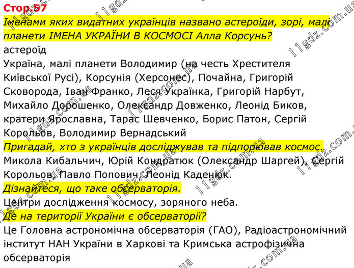 Іменами яких видатних українців названо астероїди, зорі, малі планети ІМЕНА УКРАЇНИ В КОСМОСІ Алла Корсунь? астероїд Україна, малі планети Володимир (на честь Хрестителя Київської Русі), Корсунія (Херсонес), Почайна, Григорій Сковорода, Іван Франко, Леся Українка, Григорій Нарбут, Михайло Дорошенко, Олександр Довженко, Леонід Биков, кратери Ярославна, Тарас Шевченко, Борис Патон, Сергій Корольов, Володимир Вернадський Пригадай, хто з українців досліджував та підпорював космос. Микола Кибальчич, Юрій Кондратюк (Олександр Шаргей), Сергій Корольов, Павло Попович, Леонід Каденюк. Дізнайтеся, що таке обсерваторія. Центри дослідження космосу, зоряного неба. Де на території України є обсерваторії? Це Головна астрономічна обсерваторія (ГАО), Радіоастрономічний інститут НАН України в Харкові та Кримська астрофізична обсерваторія