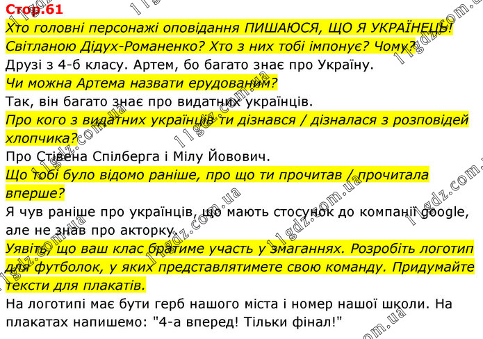 Хто головні персонажі оповідання ПИШАЮСЯ, ЩО Я УКРАЇНЕЦЬ! Світланою Дідух-Романенко? Хто з них тобі імпонує? Чому? Друзі з 4-б класу. Артем, бо багато знає про Україну. Чи можна Артема назвати ерудованим? Так, він багато знає про видатних українців. Про кого з видатних українців ти дізнався / дізналася з розповідей хлопчика? Про Стівена Спілберга і Мілу Йовович. Що тобі було відомо раніше, про що ти прочитав / прочитала вперше? Я чув раніше про українців, що мають стосунок до компанії google, але не знав про акторку. Уявіть, що ваш клас братиме участь у змаганнях. Розробіть логотип для футболок, у яких представлятимете свою команду. Придумайте тексти для плакатів. На логотипі має бути герб нашого міста і номер нашої школи. На плакатах напишемо: "4-а вперед! Тільки фінал!"