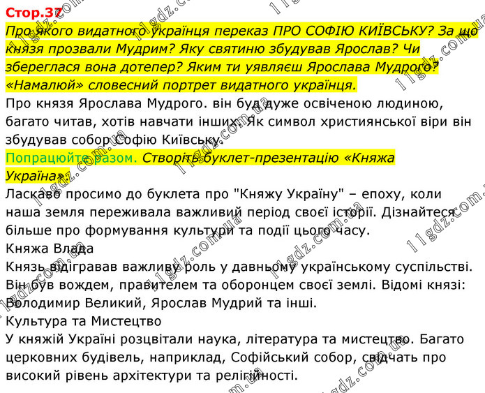 Про якого видатного українця переказ ПРО СОФІЮ КИЇВСЬКУ? За що князя прозвали Мудрим? Яку святиню збудував Ярослав? Чи збереглася вона дотепер? Яким ти уявляєш Ярослава Мудрого? «Намалюй» словесний портрет видатного українця. Про князя Ярослава Мудрого. він буд дуже освіченою людиною, багато читав, хотів навчати інших. Як символ християнської віри він збудував собор Софію Київську. Попрацюйте разом. Створіть буклет-презентацію «Княжа Україна». Ласкаво просимо до буклета про "Княжу Україну" – епоху, коли наша земля переживала важливий період своєї історії. Дізнайтеся більше про формування культури та події цього часу. Княжа Влада Князь відігравав важливу роль у давньому українському суспільстві. Він був вождем, правителем та оборонцем своєї землі. Відомі князі: Володимир Великий, Ярослав Мудрий та інші. Культура та Мистецтво У княжій Україні розцвітали наука, література та мистецтво. Багато церковних будівель, наприклад, Софійський собор, свідчать про високий рівень архітектури та релігійності.