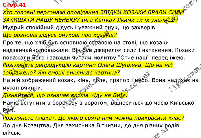 Хто головні персонажі оповідання ЗВІДКИ КОЗАКИ БРАЛИ СИЛИ ЗАХИЩАТИ НАШУ НЕНЬКУ? Інга Квітка? Якими ти їх уявляєш? Мудрий спокійний дідусь і уважний онук, що захворів. Що розповів дідусь онукові про козаків? Про те, що хліб був основною стравою на столі, що козаки надзвичайно поважали. Він був джерелом сили і натхнення. Козаки поважали його і завжди читали молитву "Отче наш" перед їжею. Розгляньте репродукцію картини Олега Шупляка. Що на ній зображено? Які емоції викликає картина? На ній зображений козак, кінь, поле, прапор і небо. Вона надихає на мужні вчинки. Дізнайтеся, що означає вислів «Іду на Ви!». Намір вступити в боротьбу з ворогом, відноситься до часів Київської Русі. Розгляньте плакат. До якого свята ним можна прикрасити клас? До дня Козацтва, Дня захисника Вітчизни, до дня різних родів військ.