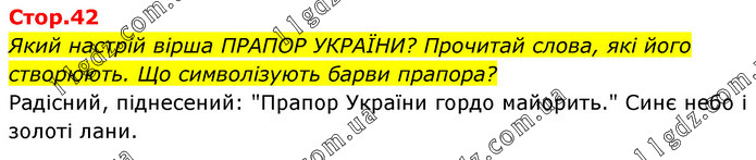 Який настрій вірша ПРАПОР УКРАЇНИ? Прочитай слова, які його створюють. Що символізують барви прапора? Радісний, піднесений: "Прапор України гордо майорить." Синє небо і золоті лани.