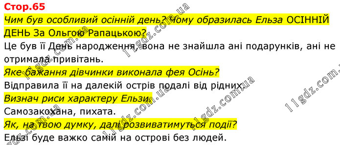 Чим був особливий осінній день? Чому образилась Ельза ОСІННІЙ ДЕНЬ За Ольгою Рапацькою? Це був її День народження, вона не знайшла ані подарунків, ані не отримала привітань. Яке бажання дівчинки виконала фея Осінь? Відправила її на далекій острів подалі від рідних. Визнач риси характеру Ельзи. Самозакохана, пихата. Як, на твою думку, далі розвиватимуться події? Ельзі буде важко самій на острові без людей.