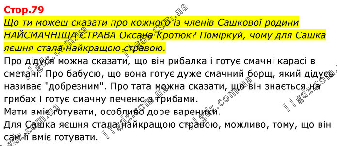 Що ти можеш сказати про кожного із членів Сашкової родини НАЙСМАЧНІША СТРАВА Оксана Кротюк? Поміркуй, чому для Сашка яєшня стала найкращою стравою. Про дідуся можна сказати, що він рибалка і готує смачні карасі в сметані. Про бабусю, що вона готує дуже смачний борщ, який дідусь називає "добрезним". Про тата можна сказати, що він знається на грибах і готує смачну печеню з грибами. Мати вміє готувати, особливо доре вареники. Для Сашка яєшня стала найкращою стравою, можливо, тому, що він сам її вміє готувати.