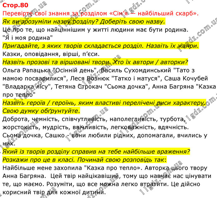Перевірте свої знання за розділом «Сім’я — найбільший скарб». Як ви зрозуміли назву розділу? Доберіть свою назву. Це про те, що найціннішим у житті людини має бути родина. "Я і моя родина" Пригадайте, з яких творів складається розділ. Назвіть їх жанри. Казки, оповідання, вірші, п’єси. Назвіть прозові та віршовані твори. Хто їх автори / авторки? Ольга Рапацька "Осінній день", Василь Сухомдинський "Тато з мамою посварилися", Леся Вознюк "Татко і матуся", Саша Кочубей "Владарка лісу", Тетяна Строкач "Сьома дочка", Анна Багряна "Казка про тепло" Назвіть героїв / героїнь, яким властиві перелічені риси характеру. Свою думку обґрунтуйте. Доброта, чемність, співчутливість, наполегливість, турбота, жорстокість, мудрість, ввічливість, легковажність, вдячність. Сьома дочка, Сашко - вони любили рідних, допомагали, вчились у них. Який із творів розділу справив на тебе найбільше враження? Розкажи про це в класі. Починай свою розповідь так: Найбільше мене захопила "Казка про тепло». Авторка цього твору Анна Багряна. Цей твір найцікавіший, тому що навчає нас цінувати те, що маємо. Розуміти, що все можна легко втратити. Це дійсно корисний твір для кожної дитини.