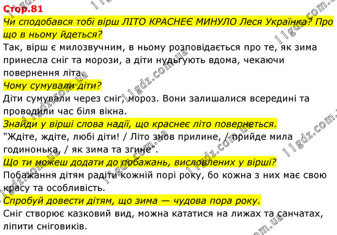 Чи сподобався тобі вірш ЛІТО КРАСНЕЄ МИНУЛО Леся Українка? Про що в ньому йдеться? Так, вірш є милозвучним, в ньому розповідається про те, як зима принесла сніг та морози, а діти нудьгують вдома, чекаючи повернення літа. Чому сумували діти? Діти сумували через сніг, мороз. Вони залишалися всередині та проводили час біля вікна. Знайди у вірші слова надії, що краснеє літо повернеться. "Ждіте, ждіте, любі діти! / Літо знов прилине, / прийде мила годинонька, / як зима та згине". Що ти можеш додати до побажань, висловлених у вірші? Побажання дітям радіти кожній порі року, бо кожна з них має свою красу та особливість. Спробуй довести дітям, що зима — чудова пора року. Сніг створює казковий вид, можна кататися на лижах та санчатах, ліпити сніговиків.