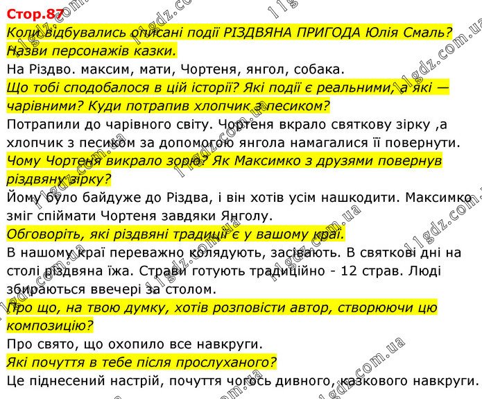 Коли відбувались описані події РІЗДВЯНА ПРИГОДА Юлія Смаль? Назви персонажів казки. На Різдво. максим, мати, Чортеня, янгол, собака. Що тобі сподобалося в цій історії? Які події є реальними, а які — чарівними? Куди потрапив хлопчик з песиком? Потрапили до чарівного світу. Чортеня вкрало святкову зірку ,а хлопчик з песиком за допомогою янгола намагалися її повернути. Чому Чортеня викрало зорю? Як Максимко з друзями повернув різдвяну зірку? Йому було байдуже до Різдва, і він хотів усім нашкодити. Максимко зміг спіймати Чортеня завдяки Янголу. Обговоріть, які різдвяні традиції є у вашому краї. В нашому краї переважно колядують, засівають. В святкові дні на столі різдвяна їжа. Страви готують традиційно - 12 страв. Люді збираються ввечері за столом. Про що, на твою думку, хотів розповісти автор, створюючи цю композицію? Про свято, що охопило все навкруги. Які почуття в тебе після прослуханого? Це піднесений настрій, почуття чогось дивного, казкового навкруги.