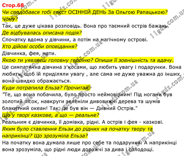 Чи сподобався тобі текст ОСІННІЙ ДЕНЬ За Ольгою Рапацькою? Чому? Так, це дуже цікава розповідь. Вона про таємний острів бажань. Де відбувалась описана подія? Спочатку вдома у дівчини, а потім на магічному острові. Хто дійові особи оповідання? Дівчинка, фея, мати. Якою ти уявляєш головну героїню? Опиши її зовнішність та вдачу. Це симпатична дівчина з косами, що любить увагу і подарунки. Вона любить, щоб їй приділяли увагу , але сама не дуже уважна до інших, вона швидко ображається. Куди потрапила Ельза? Прочитай. "Те, що вона побачила, було просто неймовірним! Під ногами був золотий пісок, навкруги зеленіли дивовижні дерева та шумів блакитний океан! Так, це був він — Дивний Острів." Що у творі казкове, а що — реальне? Реальним є дівчинка, її домівка, рідні. А острів і фея - казкові. Яким було ставлення Ельзи до рідних на початку твору та наприкінці? Що зрозуміла Ельза? На початку вона думала лише про себе та подарунки. А наприкінці вона зрозуміла, що рідні люди дорожчі за дива і солодощі.