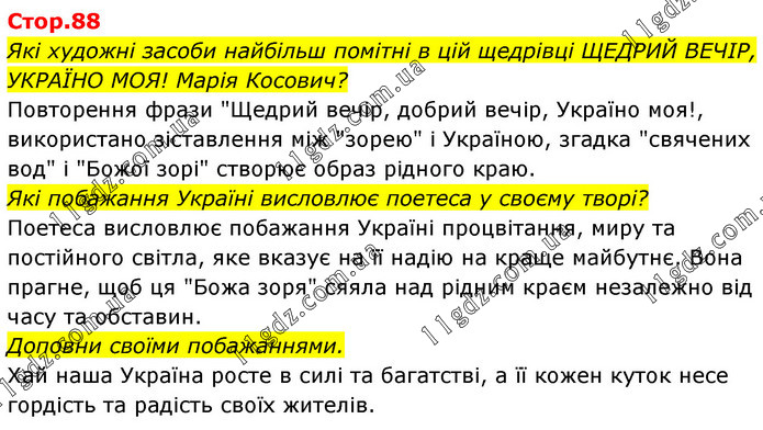Які художні засоби найбільш помітні в цій щедрівці ЩЕДРИЙ ВЕЧІР, УКРАЇНО МОЯ! Марія Косович? Повторення фрази "Щедрий вечір, добрий вечір, Україно моя!, використано зіставлення між "зорею" і Україною, згадка "свячених вод" і "Божої зорі" створює образ рідного краю. Які побажання Україні висловлює поетеса у своєму творі? Поетеса висловлює побажання Україні процвітання, миру та постійного світла, яке вказує на її надію на краще майбутнє. Вона прагне, щоб ця "Божа зоря" сяяла над рідним краєм незалежно від часу та обставин. Доповни своїми побажаннями. Хай наша Україна росте в силі та багатстві, а її кожен куток несе гордість та радість своїх жителів.