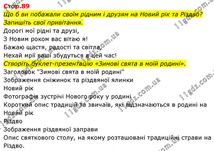 Що б ви побажали своїм рідним і друзям на Новий рік та Різдво? Запишіть свої привітання. Дорогі мої рідні та друзі, З Новим роком вас вітаю я! Бажаю щастя, радості та світла, Нехай мрії ваші збудуться в цей час! Створіть буклет-презентацію «Зимові свята в моїй родині». Заголовок "Зимові свята в моїй родині" Зображення сніжинок та різдвяної ялинки Новий рік Фотографія зустрічі Нового року у родині Короткий опис традицій та звичаїв, які відзначаються в родині на Новий рік Різдво Зображення різдвяної заправи Опис святкового столу, на якому розташовані традиційні страви на Різдво.