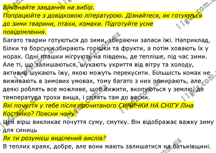 Виконайте завдання на вибір. Попрацюйте з довідковою літературою. Дізнайтеся, як готуються до зими тварини, птахи, комахи. Підготуйте усне повідомлення. Багато тварин готуються до зими, збираючи запаси їжі. Наприклад, білки та борсуки збирають горішки та фрукти, а потім ховають їх у норах. Одні пташки мігрують на південь, де тепліше, під час зими. Але ті, що залишаються, шукають укриття від вітру та холоду, активно шукають їжу, якою можуть перекусити. Більшість комах не виживають в зимових умовах, тому багато з них помирають, але деякі роблять все можливе, щоб вижити, вкопуються у землю, де температура трохи вища, і сплять там до весни. Які почуття у тебе після прочитаного СИНИЧКИ НА СНІГУ Ліна Костенко? Поясни чому. Цей вірш викликає почуття суму, смутку. Він відображає важку зиму для синиць Як ти розумієш виділений вислів? В теплих краях, добре, але вони мають залишатися на батьківщині.