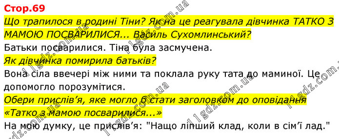 Що трапилося в родині Тіни? Як на це реагувала дівчинка ТАТКО З МАМОЮ ПОСВАРИЛИСЯ... Василь Сухомлинський? Батьки посварилися. Тіна була засмучена. Як дівчинка помирила батьків? Вона сіла ввечері між ними та поклала руку тата до маминої. Це допомогло порозумітися. Обери прислів’я, яке могло б стати заголовком до оповідання «Татко з мамою посварилися...» На мою думку, це прислів’я: "Нащо ліпший клад, коли в сім’ї лад."