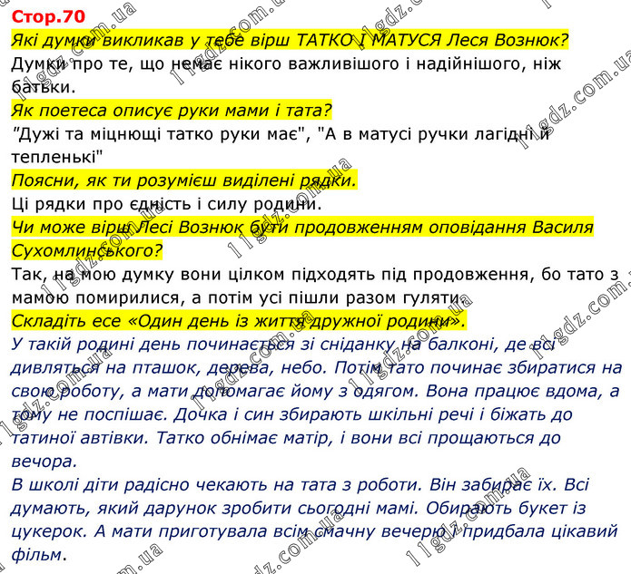 Які думки викликав у тебе вірш ТАТКО І МАТУСЯ Леся Вознюк? Думки про те, що немає нікого важливішого і надійнішого, ніж батьки. Як поетеса описує руки мами і тата? "Дужі та міцнющі татко руки має", "А в матусі ручки лагідні й тепленькі" Поясни, як ти розумієш виділені рядки. Ці рядки про єдність і силу родини. Чи може вірш Лесі Вознюк бути продовженням оповідання Василя Сухомлинського? Так, на мою думку вони цілком підходять під продовження, бо тато з мамою помирилися, а потім усі пішли разом гуляти. Складіть есе «Один день із життя дружної родини». У такій родині день починається зі сніданку на балконі, де всі дивляться на пташок, дерева, небо. Потім тато починає збиратися на свою роботу, а мати допомагає йому з одягом. Вона працює вдома, а тому не поспішає. Дочка і син збирають шкільні речі і біжать до татиної автівки. Татко обнімає матір, і вони всі прощаються до вечора. В школі діти радісно чекають на тата з роботи. Він забирає їх. Всі думають, який дарунок зробити сьогодні мамі. Обирають букет із цукерок. А мати приготувала всім смачну вечерю і придбала цікавий фільм.