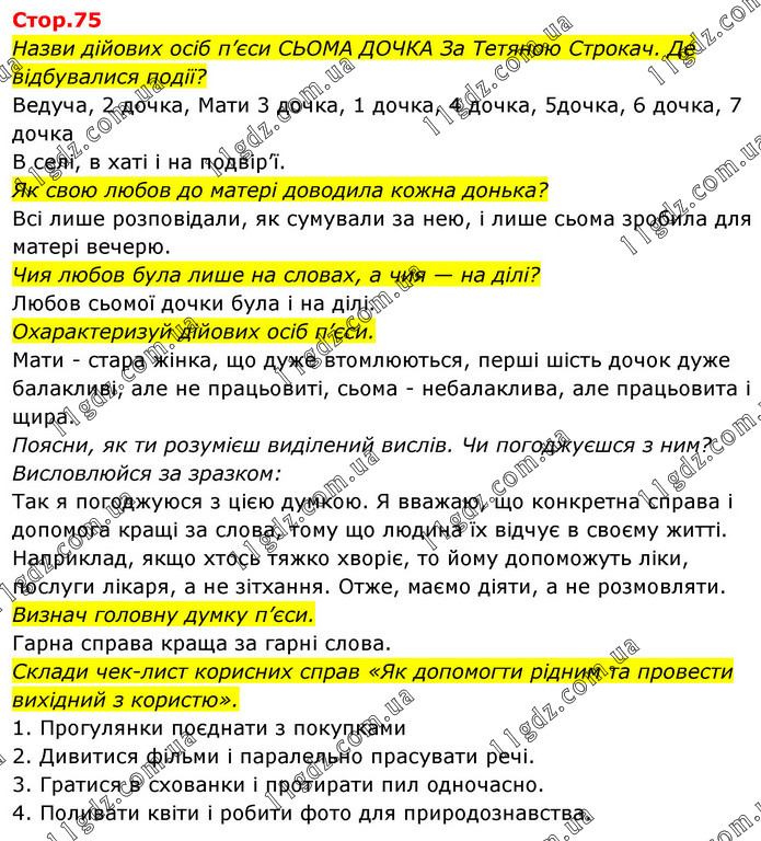 Назви дійових осіб п’єси СЬОМА ДОЧКА За Тетяною Строкач. Де відбувалися події? Ведуча, 2 дочка, Мати 3 дочка, 1 дочка, 4 дочка, 5дочка, 6 дочка, 7 дочка В селі, в хаті і на подвір’ї. Як свою любов до матері доводила кожна донька? Всі лише розповідали, як сумували за нею, і лише сьома зробила для матері вечерю. Чия любов була лише на словах, а чия — на ділі? Любов сьомої дочки була і на ділі. Охарактеризуй дійових осіб п’єси. Мати - стара жінка, що дуже втомлюються, перші шість дочок дуже балакливі, але не працьовиті, сьома - небалаклива, але працьовита і щира. Поясни, як ти розумієш виділений вислів. Чи погоджуєшся з ним? Висловлюйся за зразком: Так я погоджуюся з цією думкою. Я вважаю, що конкретна справа і допомога кращі за слова, тому що людина їх відчує в своєму житті. Наприклад, якщо хтось тяжко хворіє, то йому допоможуть ліки, послуги лікаря, а не зітхання. Отже, маємо діяти, а не розмовляти. Визнач головну думку п’єси. Гарна справа краща за гарні слова. Склади чек-лист корисних справ «Як допомогти рідним та провести вихідний з користю». 1. Прогулянки поєднати з покупками 2. Дивитися фільми і паралельно прасувати речі. 3. Гратися в схованки і протирати пил одночасно. 4. Поливати квіти і робити фото для природознавства.