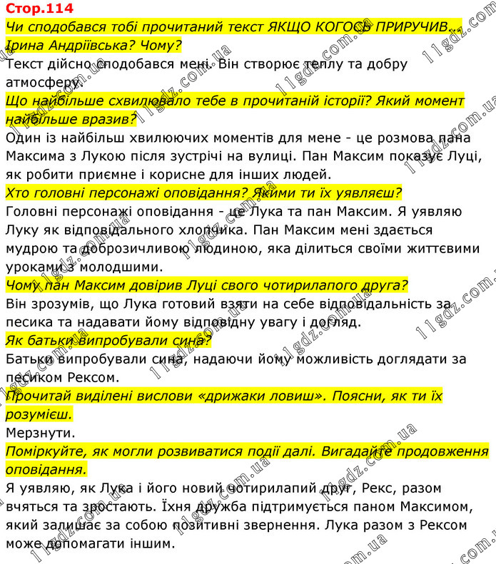 Чи сподобався тобі прочитаний текст ЯКЩО КОГОСЬ ПРИРУЧИВ... Ірина Андріївська? Чому? Текст дійсно сподобався мені. Він створює теплу та добру атмосферу. Що найбільше схвилювало тебе в прочитаній історії? Який момент найбільше вразив? Один із найбільш хвилюючих моментів для мене - це розмова пана Максима з Лукою після зустрічі на вулиці. Пан Максим показує Луці, як робити приємне і корисне для інших людей. Хто головні персонажі оповідання? Якими ти їх уявляєш? Головні персонажі оповідання - це Лука та пан Максим. Я уявляю Луку як відповідального хлопчика. Пан Максим мені здається мудрою та доброзичливою людиною, яка ділиться своїми життєвими уроками з молодшими. Чому пан Максим довірив Луці свого чотирилапого друга? Він зрозумів, що Лука готовий взяти на себе відповідальність за песика та надавати йому відповідну увагу і догляд. Як батьки випробували сина? Батьки випробували сина, надаючи йому можливість доглядати за песиком Рексом. Прочитай виділені вислови «дрижаки ловиш». Поясни, як ти їх розумієш. Мерзнути. Поміркуйте, як могли розвиватися події далі. Вигадайте продовження оповідання. Я уявляю, як Лука і його новий чотирилапий друг, Рекс, разом вчяться та зростають. Їхня дружба підтримується паном Максимом, який залишає за собою позитивні звернення. Лука разом з Рексом може допомагати іншим.