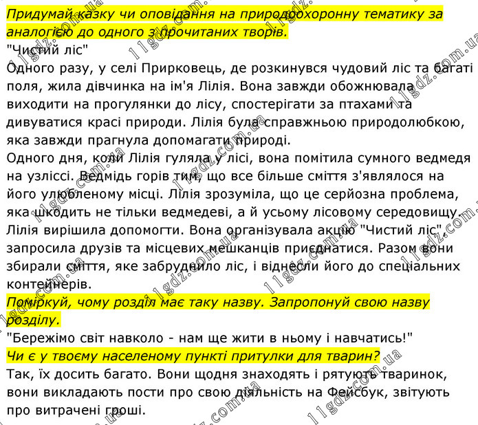 Придумай казку чи оповідання на природоохоронну тематику за аналогією до одного з прочитаних творів. "Чистий ліс" Одного разу, у селі Прирковець, де розкинувся чудовий ліс та багаті поля, жила дівчинка на ім'я Лілія. Вона завжди обожнювала виходити на прогулянки до лісу, спостерігати за птахами та дивуватися красі природи. Лілія була справжньою природолюбкою, яка завжди прагнула допомагати природі. Одного дня, коли Лілія гуляла у лісі, вона помітила сумного ведмедя на узліссі. Ведмідь горів тим, що все більше сміття з'являлося на його улюбленому місці. Лілія зрозуміла, що це серйозна проблема, яка шкодить не тільки ведмедеві, а й усьому лісовому середовищу. Лілія вирішила допомогти. Вона організувала акцію "Чистий ліс", запросила друзів та місцевих мешканців приєднатися. Разом вони збирали сміття, яке забруднило ліс, і віднесли його до спеціальних контейнерів. Поміркуй, чому розділ має таку назву. Запропонуй свою назву розділу. "Бережімо світ навколо - нам ще жити в ньому і навчатись!" Чи є у твоєму населеному пункті притулки для тварин? Так, їх досить багато. Вони щодня знаходять і рятують тваринок, вони викладають пости про свою діяльність на Фейсбук, звітують про витрачені гроші.