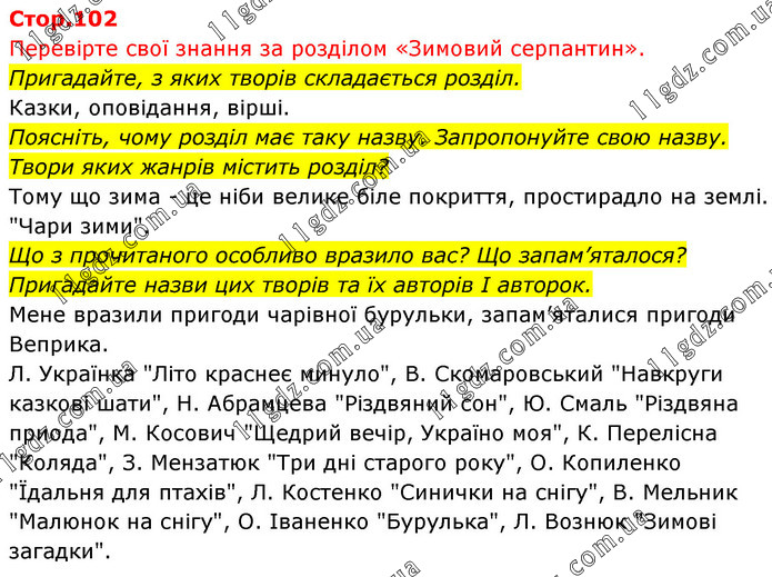 Перевірте свої знання за розділом «Зимовий серпантин». Пригадайте, з яких творів складається розділ. Казки, оповідання, вірші. Поясніть, чому розділ має таку назву. Запропонуйте свою назву. Твори яких жанрів містить розділ? Тому що зима - це ніби велике біле покриття, простирадло на землі. "Чари зими". Що з прочитаного особливо вразило вас? Що запам’яталося? Пригадайте назви цих творів та їх авторів І авторок. Мене вразили пригоди чарівної бурульки, запам’яталися пригоди Веприка. Л. Українка "Літо краснеє минуло", В. Скомаровський "Навкруги казкові шати", Н. Абрамцева "Різдвяний сон", Ю. Смаль "Різдвяна приода", М. Косович "Щедрий вечір, Україно моя", К. Перелісна "Коляда", З. Мензатюк "Три дні старого року", О. Копиленко "Їдальня для птахів", Л. Костенко "Синички на снігу", В. Мельник "Малюнок на снігу", О. Іваненко "Бурулька", Л. Вознюк "Зимові загадки".