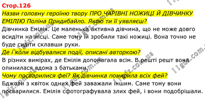 Назви головну героїню твору ПРО ЧАРІВНІ НОЖИЦІ Й ДІВЧИНКУ ЕМІЛІЮ Поліна Придибайло. Якою ти її уявляєш? Дівчинка Емілія. Це маленька активна дівчина, що не може довго всидіти на місці. Саме тому їй зробили такі ножиці. Вона точно не буде сидіти склавши руки. Де і коли відбувалися події, описані авторкою? В різних вимірах, де Емілія допомагала всім. В решті решт вона опинилася вдома з батьками. Чому посварилися феї? Як дівчинка помирила всіх фей? Бджоли з квіток одних фей заважали іншим. Саме тому вони посварилися. Емілія сфотографувала злих фей, і вони подобрішали.
