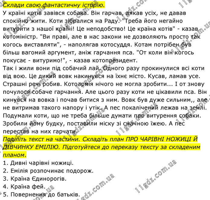 Склади свою фантастичну історію. У країні котів завівся собака. Він гарчав, лякав усіх, не давав спокійно жити. Коти зібралися на Раду. "Треба його негайно витурити з нашої країні! Це неподобство! Це країна котів" - казав котоміністр. "Ви праві, але в нас закони не дозволяють просто так когось виставляти", - наполягав котосуддя. Котам потрібен був більш вагомий аргумент, аніж гарчання пса. "От коли він когось покусає - витуримо!", - казав котопрезидент. Так і жили вони під собачий лай. Одного разу прокинулися всі коти від вою. Це дикий вовк накинувся на їхнє місто. Кусав, ламав усе. Страшні речі робив. Котоармія нічого не могла зробити... І от знову почулося собаче гарчання. Але цього разу коти не цікавили пса. Він кинувся на вовка і почав битися з ним. Вовк був дуже сильним,, але не витримав такого напору і утік. А пес покалічений лежав на землі. Подумали коти, що не треба більше думати про витурення собаки. Зробили йому будку, поставили міску зі смачною їжею. А пес перестав на них гарчати. Поділіть текст на частини. Складіть план ПРО ЧАРІВНІ НОЖИЦІ Й ДІВЧИНКУ ЕМІЛІЮ. Підготуйтеся до переказу тексту за складеним планом. 1. Дивні чарівні ножиці. 2. Емілія розпочинає подорож. 3. Країна Єдинорогів. 4. Країна фей. 5. Повернення до батьків.