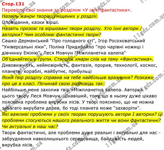 Перевірте свої знання за розділом «У світі фантастики». Назвіть жанри творів, уміщених у розділі. Оповідання, казки вірші. Назвіть прозові та віршовані твори розділу. Хто їхні автори / авторки? Чим особливі фантастичні твори? Сашко Дерманський "Про голодного єті", Ігор Росоховатський "Універсальні ліки", Поліна Придибайло "про чарівні ножиці і дівчинку Емілію", Леся Мовчун "Міжпланетна халепа" Об’єднайтесь у групи. Створіть хмари слів на тему «Фантастика». Дивовижність, неймовірність, фантазія, прорив, технології, космос, планети, кораблі, майбутнє, прибульці Який твір розділу справив на тебе найбільше враження? Розкажи про це в класі. Починай свою розповідь так: Найбільше мене захопив твір «Міжпланетна халепа. Авторка цього твору Леся Мовчун. Цікавіший, тому що в ньому дуже цікаво пояснена проблема вирубки лісів. У творі пояснено, що не можна забагато вирубати дерев, бо тоді планета може "захворіти". Які важливі проблеми у своїх творах порушують автори І авторки? Ці проблеми стосуються нашого реального життя чи вони фантастичні? Чи актуальні в наш час? Твори фантастичні, але проблеми дуже реальні і актуальні для нас - забруднення навколишнього середовища, байдужість людей, вирубка лісів.