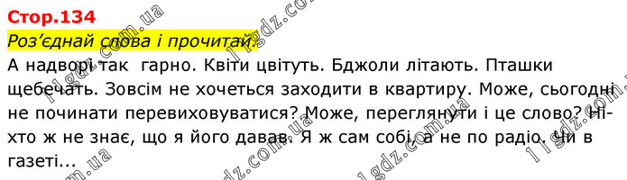 Роз’єднай слова і прочитай. А надворі так гарно. Квіти цвітуть. Бджоли літають. Пташки щебечать. Зовсім не хочеться заходити в квартиру. Може, сьогодні не починати перевиховуватися? Може, переглянути і це слово? Ні- хто ж не знає, що я його давав. Я ж сам собі, а не по радіо. Чи в газеті...