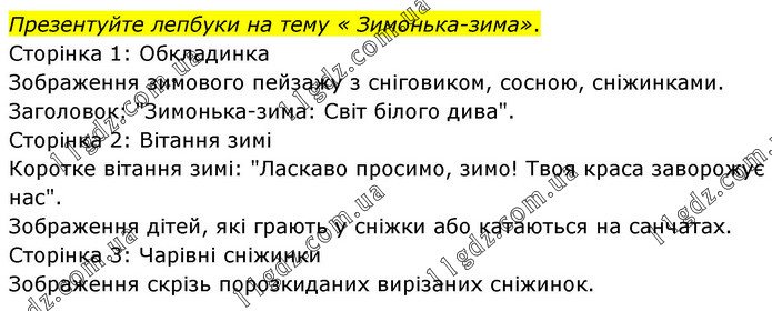 Презентуйте лепбуки на тему « Зимонька-зима». Сторінка 1: Обкладинка Зображення зимового пейзажу з сніговиком, сосною, сніжинками. Заголовок: "Зимонька-зима: Світ білого дива". Сторінка 2: Вітання зимі Коротке вітання зимі: "Ласкаво просимо, зимо! Твоя краса заворожує нас". Зображення дітей, які грають у сніжки або катаються на санчатах. Сторінка 3: Чарівні сніжинки Зображення скрізь порозкиданих вирізаних сніжинок.