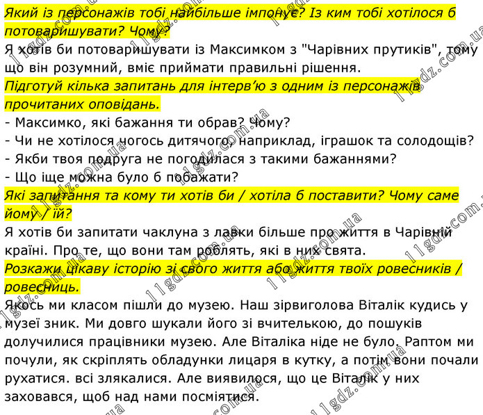 Який із персонажів тобі найбільше імпонує? Із ким тобі хотілося б потоваришувати? Чому? Я хотів би потоваришувати із Максимком з "Чарівних прутиків", тому що він розумний, вміє приймати правильні рішення. Підготуй кілька запитань для інтерв’ю з одним із персонажів прочитаних оповідань. - Максимко, які бажання ти обрав? Чому? - Чи не хотілося чогось дитячого, наприклад, іграшок та солодощів? - Якби твоя подруга не погодилася з такими бажаннями? - Що іще можна було б побажати? Які запитання та кому ти хотів би / хотіла б поставити? Чому саме йому / їй? Я хотів би запитати чаклуна з лавки більше про життя в Чарівній країні. Про те, що вони там роблять, які в них свята. Розкажи цікаву історію зі свого життя або життя твоїх ровесників / ровесниць. Якось ми класом пішли до музею. Наш зірвиголова Віталік кудись у музеї зник. Ми довго шукали його зі вчителькою, до пошуків долучилися працівники музею. Але Віталіка ніде не було. Раптом ми почули, як скріплять обладунки лицаря в кутку, а потім вони почали рухатися. всі злякалися. Але виявилося, що це Віталік у них заховався, щоб над нами посміятися.