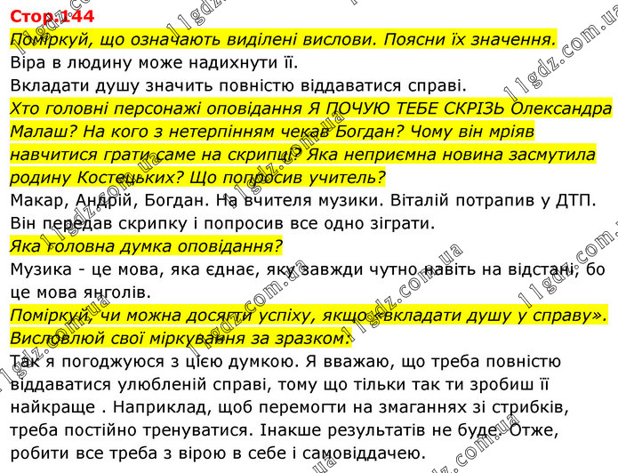 Поміркуй, що означають виділені вислови. Поясни їх значення. Віра в людину може надихнути її. Вкладати душу значить повністю віддаватися справі. Хто головні персонажі оповідання Я ПОЧУЮ ТЕБЕ СКРІЗЬ Олександра Малаш? На кого з нетерпінням чекав Богдан? Чому він мріяв навчитися грати саме на скрипці? Яка неприємна новина засмутила родину Костецьких? Що попросив учитель? Макар, Андрій, Богдан. На вчителя музики. Віталій потрапив у ДТП. Він передав скрипку і попросив все одно зіграти. Яка головна думка оповідання? Музика - це мова, яка єднає, яку завжди чутно навіть на відстані, бо це мова янголів. Поміркуй, чи можна досягти успіху, якщо «вкладати душу у справу». Висловлюй свої міркування за зразком: Так я погоджуюся з цією думкою. Я вважаю, що треба повністю віддаватися улюбленій справі, тому що тільки так ти зробиш її найкраще . Наприклад, щоб перемогти на змаганнях зі стрибків, треба постійно тренуватися. Інакше результатів не буде. Отже, робити все треба з вірою в себе і самовіддачею.