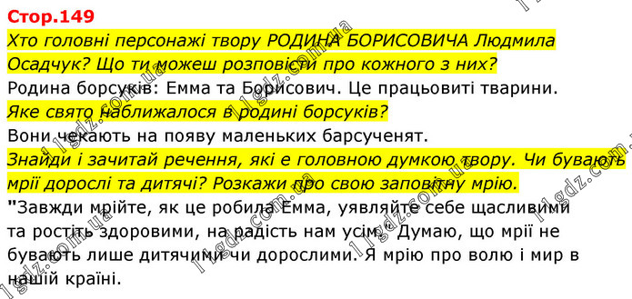Хто головні персонажі твору РОДИНА БОРИСОВИЧА Людмила Осадчук? Що ти можеш розповісти про кожного з них? Родина борсуків: Емма та Борисович. Це працьовиті тварини. Яке свято наближалося в родині борсуків? Вони чекають на появу маленьких барсученят. Знайди і зачитай речення, які е головною думкою твору. Чи бувають мрії дорослі та дитячі? Розкажи про свою заповітну мрію. "Завжди мрійте, як це робила Емма, уявляйте себе щасливими та ростіть здоровими, на радість нам усім." Думаю, що мрії не бувають лише дитячими чи дорослими. Я мрію про волю і мир в нашій країні.