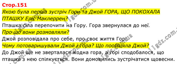 Якою була перша зустріч Гори та Джой ГОРА, ЩО ПОКОХАЛА ПТАШКУ Еліс Маклеррен? Пташка сіла перепочити на Гору. Гора звернулася до неї. Про що вони розмовляли? Джой розповідала про себе, про своє життя Горі. Чому потоваришували Джой і Гора? Що пообіцяла Джой? До Джой ще не зверталася жодна гора, а горі сподобалося, що пташка з нею спілкується. Вони домовились зустрічатися щовесни.