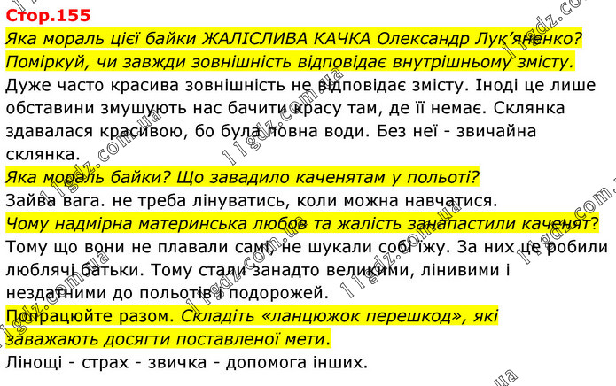 Яка мораль цієї байки ЖАЛІСЛИВА КАЧКА Олександр Лук’яненко? Поміркуй, чи завжди зовнішність відповідає внутрішньому змісту. Дуже часто красива зовнішність не відповідає змісту. Іноді це лише обставини змушують нас бачити красу там, де її немає. Склянка здавалася красивою, бо була повна води. Без неї - звичайна склянка. Яка мораль байки? Що завадило каченятам у польоті? Зайва вага. не треба лінуватись, коли можна навчатися. Чому надмірна материнська любов та жалість занапастили каченят? Тому що вони не плавали самі, не шукали собі їжу. За них це робили люблячі батьки. Тому стали занадто великими, лінивими і нездатними до польотів і подорожей. Попрацюйте разом. Складіть «ланцюжок перешкод», які заважають досягти поставленої мети. Лінощі - страх - звичка - допомога інших.