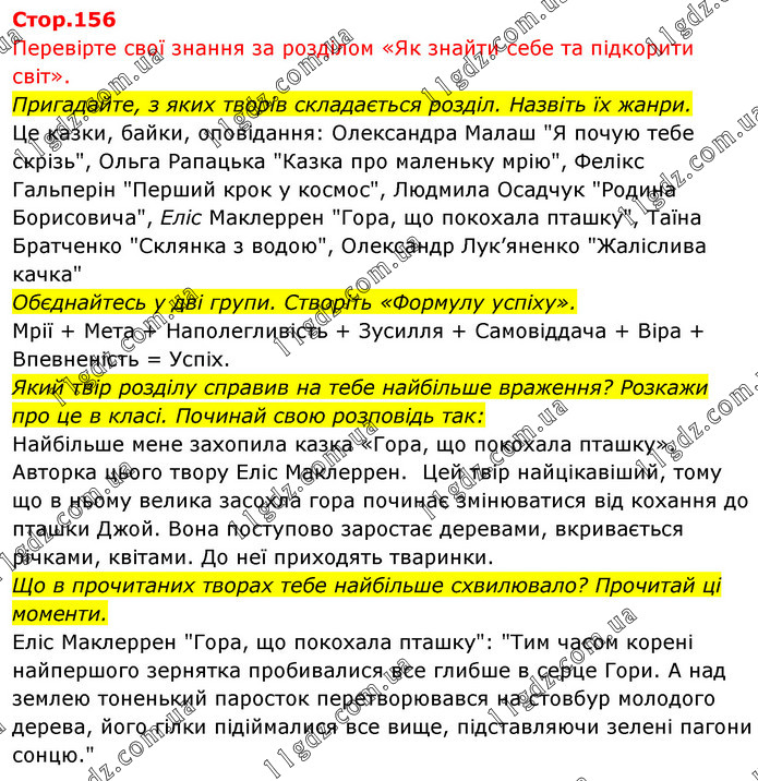 Перевірте свої знання за розділом «Як знайти себе та підкорити світ». Пригадайте, з яких творів складається розділ. Назвіть їх жанри. Це казки, байки, оповідання: Олександра Малаш "Я почую тебе скрізь", Ольга Рапацька "Казка про маленьку мрію", Фелікс Гальперін "Перший крок у космос", Людмила Осадчук "Родина Борисовича", Еліс Маклеррен "Гора, що покохала пташку", Таїна Братченко "Склянка з водою", Олександр Лук’яненко "Жаліслива качка" Обєднайтесь у дві групи. Створіть «Формулу успіху». Мрії + Мета + Наполегливість + Зусилля + Самовіддача + Віра + Впевненість = Успіх. Який твір розділу справив на тебе найбільше враження? Розкажи про це в класі. Починай свою розповідь так: Найбільше мене захопила казка «Гора, що покохала пташку». Авторка цього твору Еліс Маклеррен. Цей твір найцікавіший, тому що в ньому велика засохла гора починає змінюватися від кохання до пташки Джой. Вона поступово заростає деревами, вкривається річками, квітами. До неї приходять тваринки. Що в прочитаних творах тебе найбільше схвилювало? Прочитай ці моменти. Еліс Маклеррен "Гора, що покохала пташку": "Тим часом корені найпершого зернятка пробивалися все глибше в серце Гори. А над землею тоненький паросток перетворювався на стовбур молодого дерева, його гілки підіймалися все вище, підставляючи зелені пагони сонцю."
