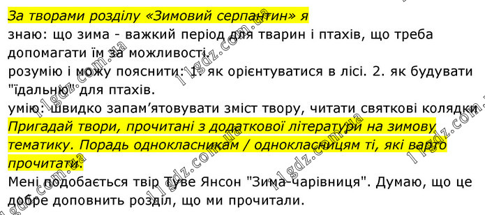 За творами розділу «Зимовий серпантин» я знаю: що зима - важкий період для тварин і птахів, що треба допомагати їм за можливості. розумію і можу пояснити: 1. як орієнтуватися в лісі. 2. як будувати "їдальню" для птахів. умію: швидко запам’ятовувати зміст твору, читати святкові колядки Пригадай твори, прочитані з додаткової літератури на зимову тематику. Порадь однокласникам / однокласницям ті, які варто прочитати. Мені подобається твір Туве Янсон "Зима-чарівниця". Думаю, що це добре доповнить розділ, що ми прочитали.