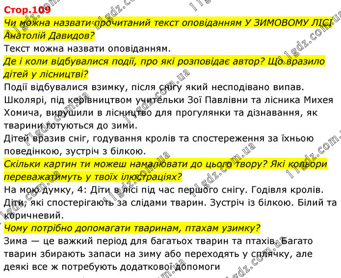 Чи можна назвати прочитаний текст оповіданням У ЗИМОВОМУ ЛІСІ Анатолій Давидов? Текст можна назвати оповіданням. Де і коли відбувалися події, про які розповідає автор? Що вразило дітей у лісництві? Події відбувалися взимку, після снігу який несподівано випав. Школярі, під керівництвом учительки Зої Павлівни та лісника Михея Хомича, вирушили в лісництво для прогулянки та дізнавання, як тварини готуються до зими. Дітей вразив сніг, годування кролів та спостереження за їхньою поведінкою, зустріч з білкою. Скільки картин ти можеш намалювати до цього твору? Які кольори переважатимуть у твоїх ілюстраціях? На мою думку, 4: Діти в лісі під час першого снігу. Годівля кролів. Діти, які спостерігають за слідами тварин. Зустріч із білкою. Білий та коричневий. Чому потрібно допомагати тваринам, птахам узимку? Зима — це важкий період для багатьох тварин та птахів. Багато тварин збирають запаси на зиму або переходять у сплячку, але деякі все ж потребують додаткової допомоги