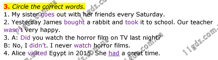 Circle the correct words. 1. My sister goes out with her friends every Saturday. 2. Yesterday James bought a rabbit and took it to school. Our teacher wasn’t very happy. 3. A: Did you watch the horror film on TV last night? B: No, I didn’t. I never watch horror films. 4. Alice visited Egypt in 2015. She had a great time.