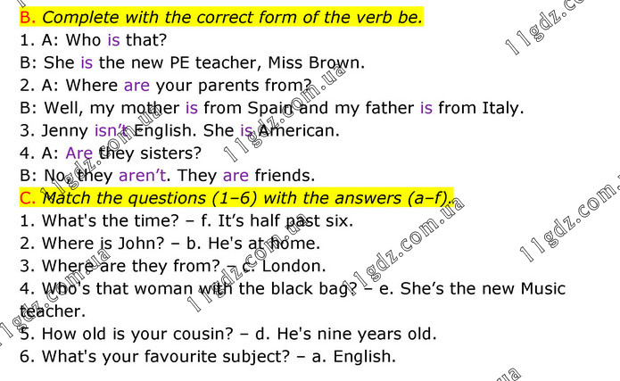 B. Complete with the correct form of the verb be. 1. A: Who is that? B: She is the new PE teacher, Miss Brown. 2. A: Where are your parents from? B: Well, my mother is from Spain and my father is from Italy. 3. Jenny isn’t English. She is American. 4. A: Are they sisters? B: No, they aren’t. They are friends. C. Match the questions (1–6) with the answers (a–f). 1. What's the time? – f. It’s half past six. 2. Where is John? – b. He's at home. 3. Where are they from? – c. London. 4. Who's that woman with the black bag? – e. She’s the new Music teacher. 5. How old is your cousin? – d. He's nine years old. 6. What's your favourite subject? – a. English.
