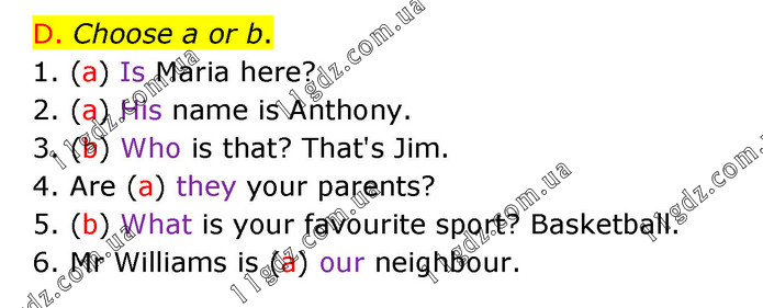 D. Choose a or b. 1. (a) Is Maria here? 2. (a) His name is Anthony. 3. (b) Who is that? That's Jim. 4. Are (a) they your parents? 5. (b) What is your favourite sport? Basketball. 6. Mr Williams is (a) our neighbour.