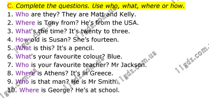 C. Complete the questions. Use who, what, where or how. 1. Who are they? They are Matt and Kelly. 2. Where is Tony from? He's from the USA. 3. What's the time? It's twenty to three. 4. How old is Susan? She’s fourteen. 5. What is this? It's a pencil. 6. What's your favourite colour? Blue. 7. Who is your favourite teacher? Mr Jackson. 8. Where is Athens? It's in Greece. 9. Who is that man? He is Mr Smith. 10. Where is George? He’s at school.