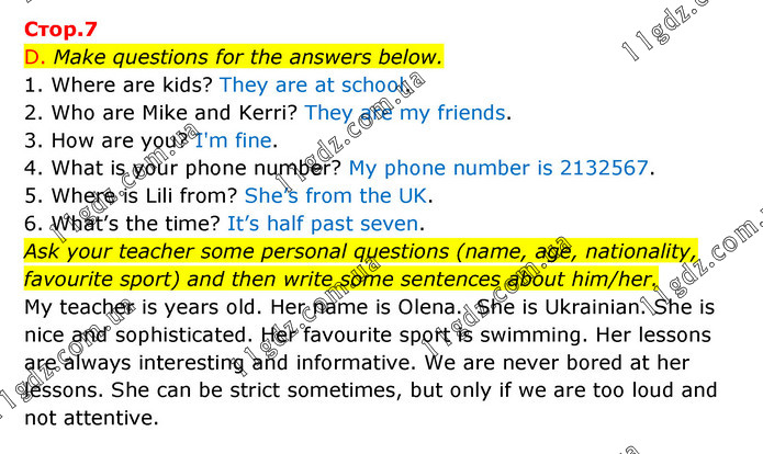 D. Make questions for the answers below. 1. Where are kids? They are at school. 2. Who are Mike and Kerri? They are my friends. 3. How are you? I'm fine. 4. What is your phone number? My phone number is 2132567. 5. Where is Lili from? She’s from the UK. 6. What’s the time? It’s half past seven. Ask your teacher some personal questions (name, age, nationality, favourite sport) and then write some sentences about him/her. My teacher is years old. Her name is Olena. She is Ukrainian. She is nice and sophisticated. Her favourite sport is swimming. Her lessons are always interesting and informative. We are never bored at her lessons. She can be strict sometimes, but only if we are too loud and not attentive.