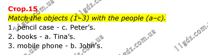 Match the objects (1–3) with the people (a–c). 1. pencil case - c. Peter’s. 2. books - a. Tina’s. 3. mobile phone - b. John's.