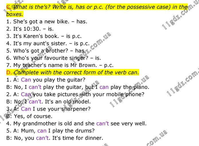 C. What is the’s? Write is, has or p.c. (for the possessive case) in the boxes. 1. She’s got a new bike. – has. 2. It's 10:30. – is. 3. It's Karen's book. – is p.c. 4. It's my aunt's sister. – is p.c. 5. Who’s got a brother? – has. 6. Who's your favourite singer? – is. 7. My teacher's name is Mr Brown. – p.c. D. Complete with the correct form of the verb can. 1. A: Can you play the guitar? B: No, I can’t play the guitar, but I can play the piano. 2. A: Can you take pictures with your mobile phone? B: No, I can’t. It's an old model. 3. A: Can I use your sharpener? B: Yes, of course. 4. My grandmother is old and she can’t see very well. 5. A: Mum, can I play the drums? B: No, you can’t. It's time for dinner.