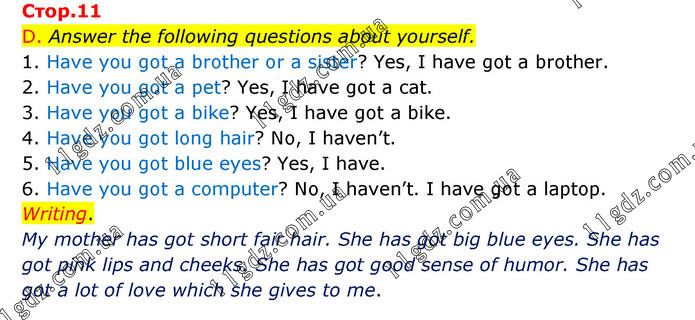 D. Answer the following questions about yourself. 1. Have you got a brother or a sister? Yes, I have got a brother. 2. Have you got a pet? Yes, I have got a cat. 3. Have you got a bike? Yes, I have got a bike. 4. Have you got long hair? No, I haven’t. 5. Have you got blue eyes? Yes, I have. 6. Have you got a computer? No, I haven’t. I have got a laptop. Writing. My mother has got short fair hair. She has got big blue eyes. She has got pink lips and cheeks. She has got good sense of humor. She has got a lot of love which she gives to me.