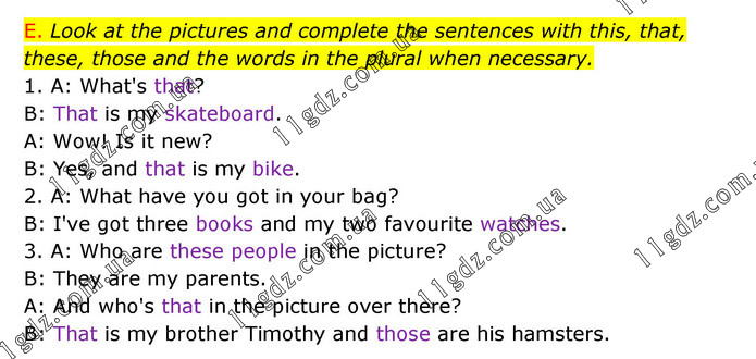 E. Look at the pictures and complete the sentences with this, that, these, those and the words in the plural when necessary. 1. A: What's that? B: That is my skateboard. A: Wow! Is it new? B: Yes, and that is my bike. 2. A: What have you got in your bag? B: I've got three books and my two favourite watches. 3. A: Who are these people in the picture? B: They are my parents. A: And who's that in the picture over there? B: That is my brother Timothy and those are his hamsters.