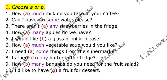 C. Choose a or b. 1. How (a) much milk do you take in your coffee? 2. Can I have (b) some water please? 3. There aren't (a) any strawberries in the fridge. 4. How (a) many apples do we have? 5. I would like (b) a glass of milk, please! 6. How (a) much vegetable soup would you like? 7. I need (a) some things from the supermarket. 8. Is there (b) any butter in the fridge? 9. How (b) many bananas do you need for the fruit salad? 10. I'd like to have (b) a fruit for dessert.