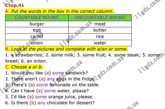A. Put the words in the box in the correct column. COUNTABLE NOUNS UNCOUNTABLE NOUNS burger meat egg butter carrot rice onion water B. Look at the pictures and complete with a/an or some. 1. a strawberries; 2. some milk; 3. some fruit; 4. some steak; 5. some bread; 6. an onion. C. Choose a or b. 1. Would you like (a) some sandwich? 2. There aren't (a) any eggs in the fridge. 3. There's (a) some lemonade on the table. 4. Can I have (a) some water, please? 5. I'd like (a) some orange juice, please. 6. Is there (b) any chocolate for dessert?