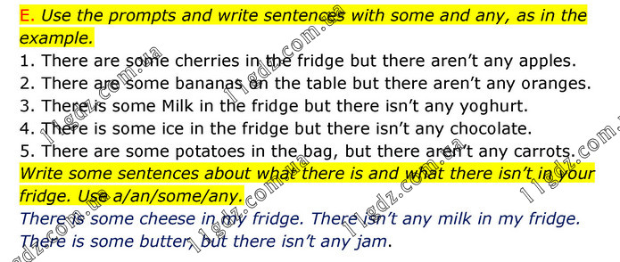 E. Use the prompts and write sentences with some and any, as in the example. 1. There are some cherries in the fridge but there aren’t any apples. 2. There are some bananas on the table but there aren’t any oranges. 3. There is some Milk in the fridge but there isn’t any yoghurt. 4. There is some ice in the fridge but there isn’t any chocolate. 5. There are some potatoes in the bag, but there aren’t any carrots. Write some sentences about what there is and what there isn’t in your fridge. Use a/an/some/any. There is some cheese in my fridge. There isn’t any milk in my fridge. There is some butter, but there isn’t any jam.