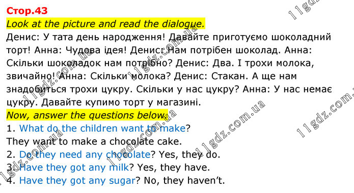 Look at the picture and read the dialogue. Денис: У тата день народження! Давайте приготуємо шоколадний торт! Анна: Чудова ідея! Денис: Нам потрібен шоколад. Анна: Скільки шоколадок нам потрібно? Денис: Два. І трохи молока, звичайно! Анна: Скільки молока? Денис: Стакан. А ще нам знадобиться трохи цукру. Скільки у нас цукру? Анна: У нас немає цукру. Давайте купимо торт у магазині. Now, answer the questions below. 1. What do the children want to make? They want to make a chocolate cake. 2. Do they need any chocolate? Yes, they do. 3. Have they got any milk? Yes, they have. 4. Have they got any sugar? No, they haven’t.