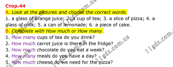 A. Look at the pictures and choose the correct words. 1. a glass of orange juice; 2. a cup of tea; 3. a slice of pizza; 4. a glass of milk; 5. a can of lemonade; 6. a piece of cake. B. Complete with How much or How many. 1. How many cups of tea do you drink? 2. How much carrot juice is there in the fridge? 3. How much chocolate do you eat a week? 4. How many meals do you have a day? 5. How much cheese do we need for the pizza?