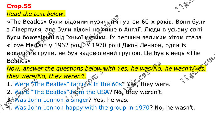Read the text below. «The Beatles» були відомим музичним гуртом 60-х років. Вони були з Ліверпуля, але були відомі не лише в Англії. Люди в усьому світі були божевільні від їхньої музики. Їх першим великим хітом стала «Love Me Do» у 1962 році. У 1970 році Джон Леннон, один із вокалістів групи, не був задоволений групою. Це був кінець «The Beaties». Now, answer the questions below with Yes, he was/No, he wasn’t/Yes, they were/No, they weren’t. 1. Were “The Beaties” famous in the 60s? Yes, they were. 2. Were “The Beatles” from the USA? No, they weren’t. 3. Was John Lennon a singer? Yes, he was. 4. Was John Lennon happy with the group in 1970? No, he wasn’t.